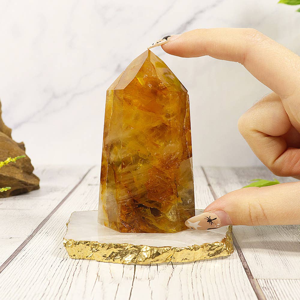 The Golden Healer Quartz Polished Point is a six sided gemstone having a luminous golden yellow color, flowing internal layers and sparkle. This crystal, with its potent healing and stabilizing properties, radiates sun and light energy to all chakras through the apex of the point, thus providing a path of enlightenment for higher self-connection, soul alignment and spiritual expansion. It also protects against toxic behaviors and negative emotions that aids in improving overall wellness. Ideal for Meditation and other healing practices. Stunning décor item and precious gift for crystal lovers. The Golden Healer Quartz Point is undoubtedly a premium quality, ultra-high vibrational, self-empowerment quartz crystal for all crystal healing needs. Buy our Golden Healer Polished Point to elevate your product offering to the next level and entice your customers.