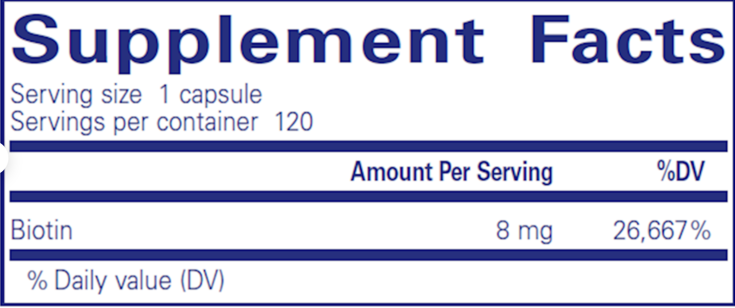Essential B vitamin* Biotin is a water-soluble B vitamin that is an essential co-factor for several carboxylation reactions involved in metabolism. Recent studies have expanded biotin’s metabolic role, claiming that the vitamin maintains healthy genetic expression of the many enzymes for which it is a cofactor* • Helps support healthy hair and nails* • Made with hypoallergenic, vegan ingredients