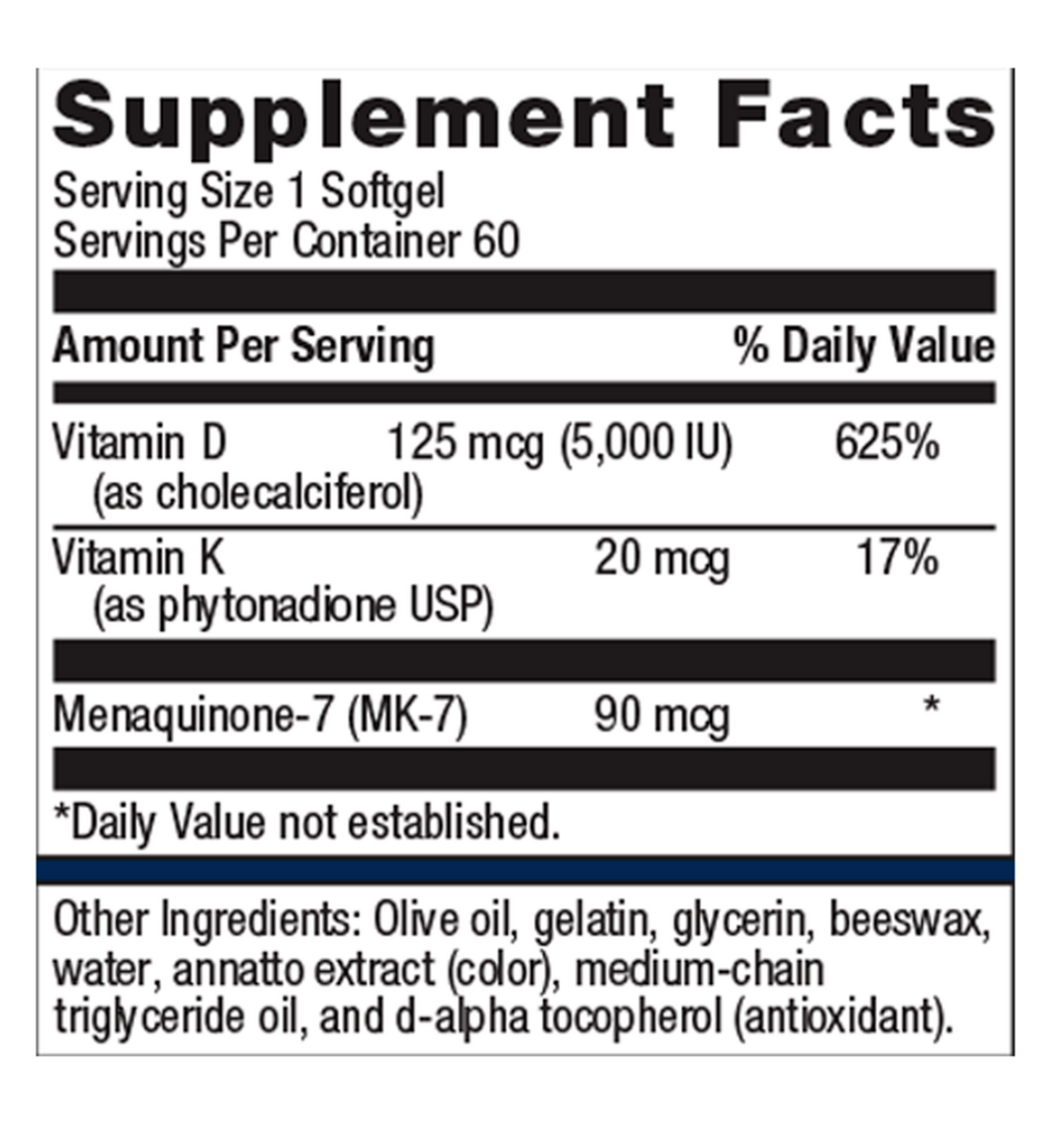 High Potency, Bioactive Vitamin D with Vitamin K D3 5,000 + K provides 5,000 IU per softgel of vitamin D (as D3), designed for greater absorption. This high potency formula also includes bioavailable forms of vitamin K2 (menaquinone-7) to complement vitamin D.